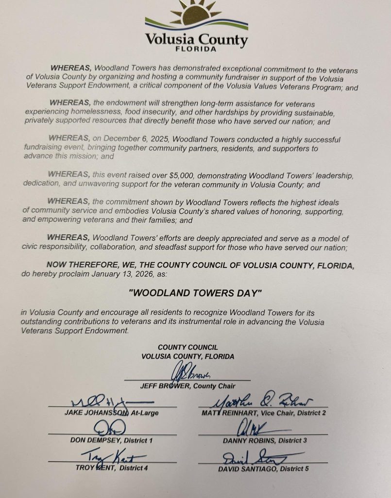 Woodland Towers Honored by Volusia County for Supporting Local Veterans