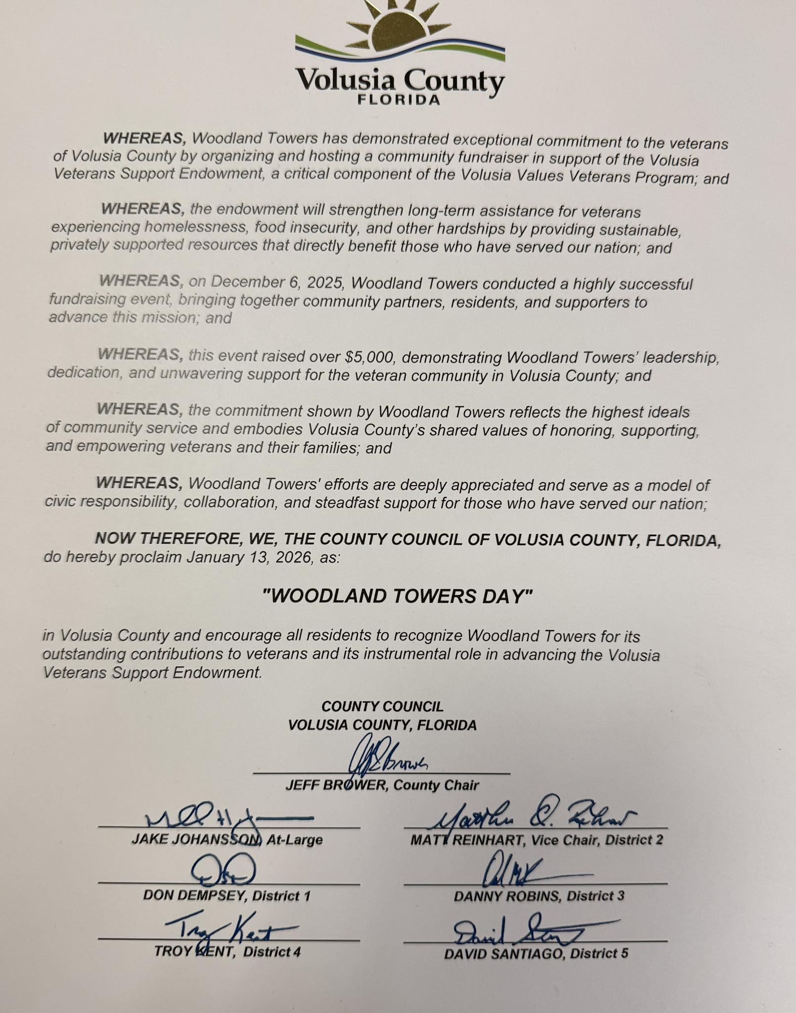 Woodland Towers is proud to have received a formal thank you from Volusia County Veterans following the fundraiser we hosted last December in support of Volusia Values Veterans. It was a meaningful event that brought together residents, staff, and community partners to give back to those who have served our country.